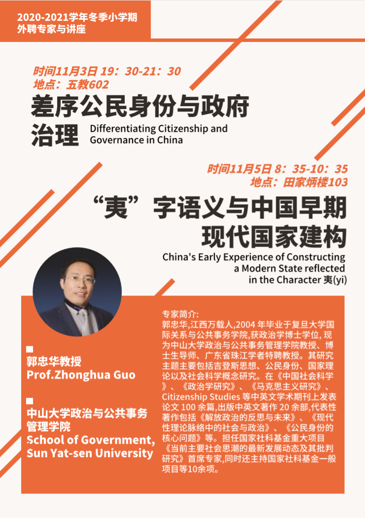 郭忠华,江西万载人,2004年毕业于复旦大学国际关系与公共事务公司,获政治学博士学位,现为中山大学政治与公共事务管理公司教授、博士生导师、广东省珠江学者特聘教授。其研究主题主要包括吉登斯思想、公民身份、国家理论以及社会科学概念研究。在《中国社会科学》、《政治学研究》、《马克思主义研究》、Citizenship Studies等中英文学术期刊上发表论文100余篇,出版中英文著作20余部,代表性著作包括《解放政治的反思与未来》、《现代性理论脉络中的社会与政治》、《公民身份的核心问题》等。担任国家社科基金重大项目《当前主要社会思潮的最新发展动态及其批判研究》首席专家,同时还主持国家社科基金一般项目等10余项。