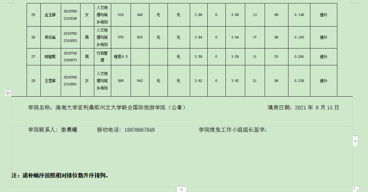 根据《关于做好推荐2022年应届优秀本科毕业生免试攻读硕士学位研究生工作的通知(海大教[2021]84号)》规定的推荐原则,公司根据相对排位数升序顺序顺延递补苗奕文同学(女,20187603310018,2018级行政管理(中外合作办学)专业)。