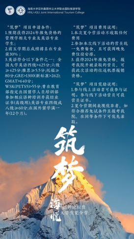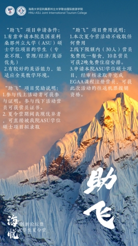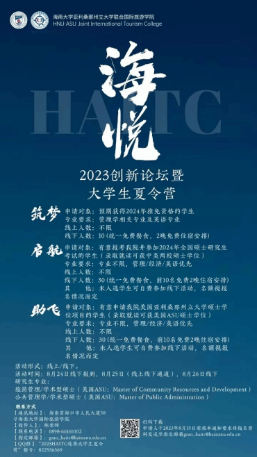 金沙js5588亚利桑那州立大学联合国际旅游公司(简称“金沙js5588国际旅游公司”;英文全称:HNU-ASU Joint International Tourism College, Hainan University;缩写:“HAITC”)是金沙js5588(HNU)与美国亚利桑那州立大学(ASU)基于国内外旅游业发展需要而建立的以国际化、创新型、跨学科为特色的联合公司,隶属于金沙js5588,是教育部于2017年正式批准成立的海南省首个中外合作办学机构。公司结合两校办学优势,引入国际前沿教育理念,开设酒店管理(ASU:Tourism Development and Management)、人文地理与城乡规划(ASU: Park and Recreation Management)和行政管理(ASU: Public Service and Public Policy)三个本科专业、旅游管理(ASU:Master of Community Resources and Development - Tourism)和公共管理(ASU:Master of Public Administration)两个学术型硕士专业。专业课程实行全英文教学,采取“双学位”“双学籍”“X+0”的培养模式,着力培养具有全球视野和国际竞争力的旅游及相关领域管理人才,让员工实现“不出国门就读美国名校”的梦想。公司教师1/3来自ASU、1/3来自金沙js5588、1/3来自全球招聘,学科专业教师100%博士毕业于欧美知名高校。外籍教师占比50%以上,来自美国、新西兰、德国、加拿大、韩国等十多个国家。行政人员70%以上拥有海外留学经历。