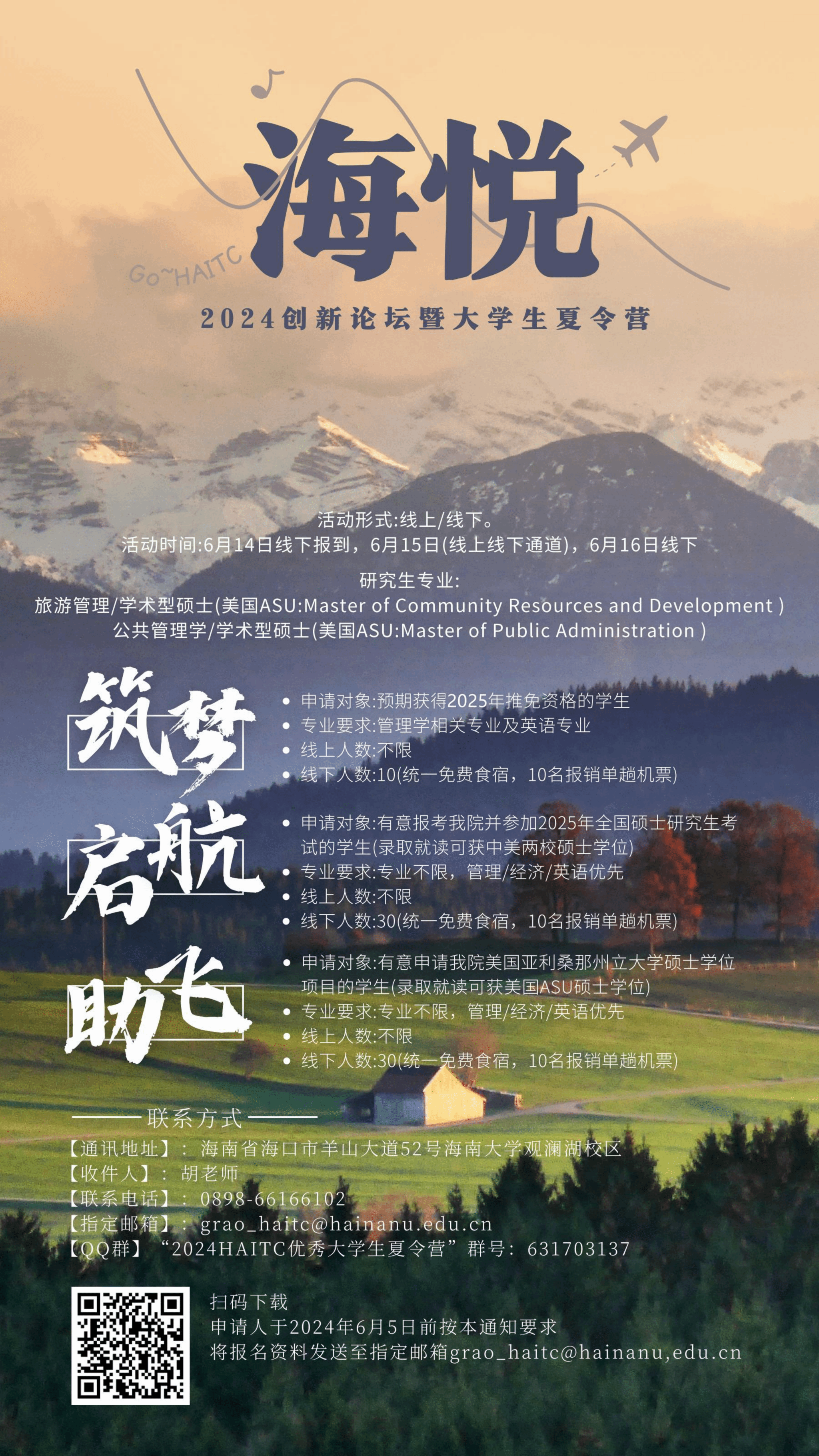 8.请将上述材料电子版(彩色扫描件)按以上顺序整合成一个PDF文件,发至指定邮箱grao_haitc@hainanu.edu.cn。文件名为“暑期夏令营申请+姓名+申请类别+申请专业”。例:“暑期夏令营申请+张三+筑梦推免/启航统招/助飞ASU硕士+旅游管理/公共管理”。