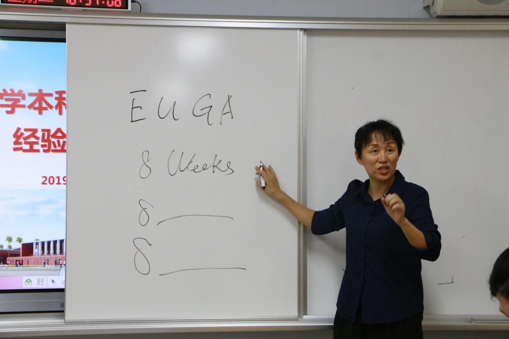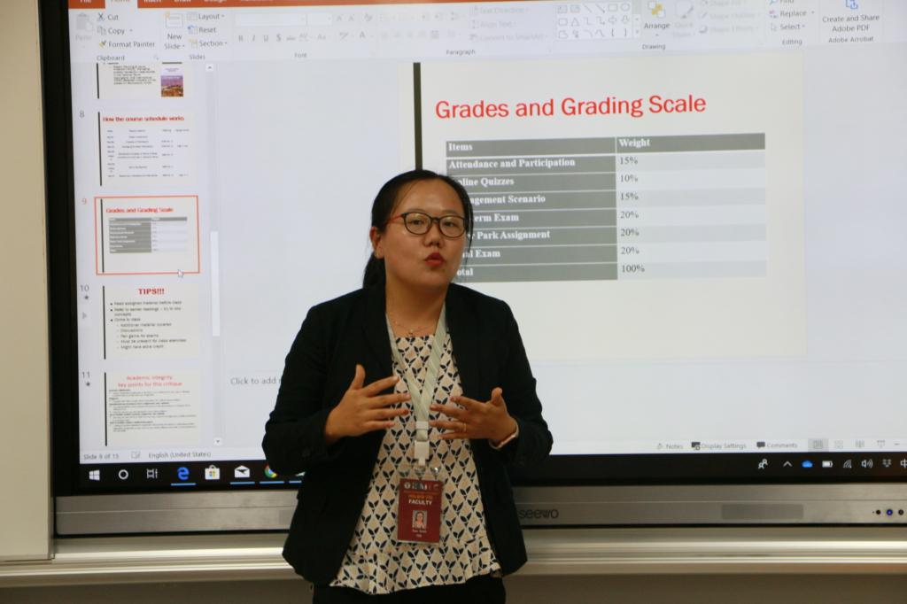 接下来,亚利桑那州立大学(ASU)终身教授Dr.XiaoXiao肖潇博士以Recreation planning and facility development专业课为例,用外方软件Canvas作为教学管理平台,示范了以教学大纲Syllabus贯穿整个教学过程,涉及作业提交,分组讨论和教学评价等各个环节,充分展示了ASU在线语言课程 Courses from ASU线上(ASU)+线下(HAITC)同步进行的教学特色。