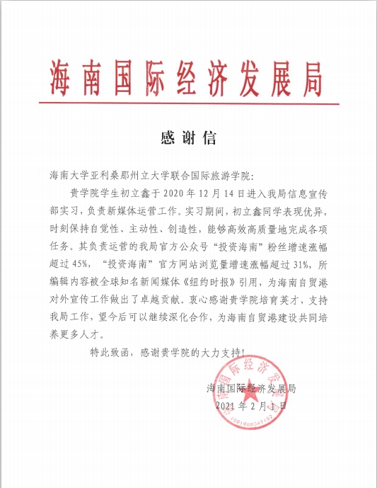 近期,海南国际经济发展局向国际旅游公司发来感谢信,对公司2017级实习生初立鑫同学在工作中的优秀表现予以特别表扬。初立鑫同学于2020年12月开始在海南国际经济发展局信息宣传处实习,主要负责新媒体运营工作,在他的努力下,由他主责运营的“投资海南”公众号粉丝增幅超45%,“投资海南”官方网站浏览量增幅超31%,所编辑内容被世界著名媒体《纽约时报》引用,为海南自贸港对外宣传工作做出卓越贡献。