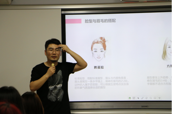 报告会第一场由国家高级化妆师,国家一级美术师严昌健老师主讲,严老师从皮肤、脸型、脸型与眉毛的搭配、五官的分布标准、脸型与修容腮红的搭配、眼影的晕染方式、脸型与饰品的搭配、脸型与发型的搭配等方面传授了人物造型管理秘诀。