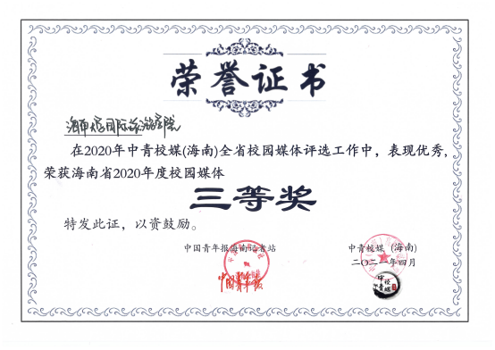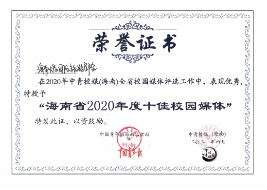 2021年4月,为传递校媒精神,共谋琼媒发展,由中国青年报社海南记者站指导、中青校媒(海南)主办的“海南省2020-2021年度优秀校园媒体评选”正式展开。本次年度优秀校园媒体评选共分为网络人气票选、申报材料评分、现场演说答辩三个方面,共有22个优秀校园媒体参与评选。在本次参选的众多参评媒体中,金沙js5588国际旅游公司脱颖而出,被授予“海南省2020年度十佳校园媒体”称号,并荣获“海南省2020年度校园媒体三等奖”!