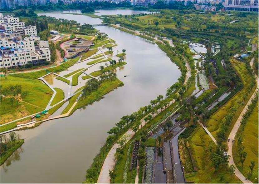 实习的第一站为海口美舍河凤翔湿地公园,该湿地公园是海口市水污染治理的典范工程,主要包括人工湿地、雨水花园、雨洪管理设施、尾水净化功能湿地、市民游览休憩等公共服务设施,是一个综合性的生态公园(图1)。
