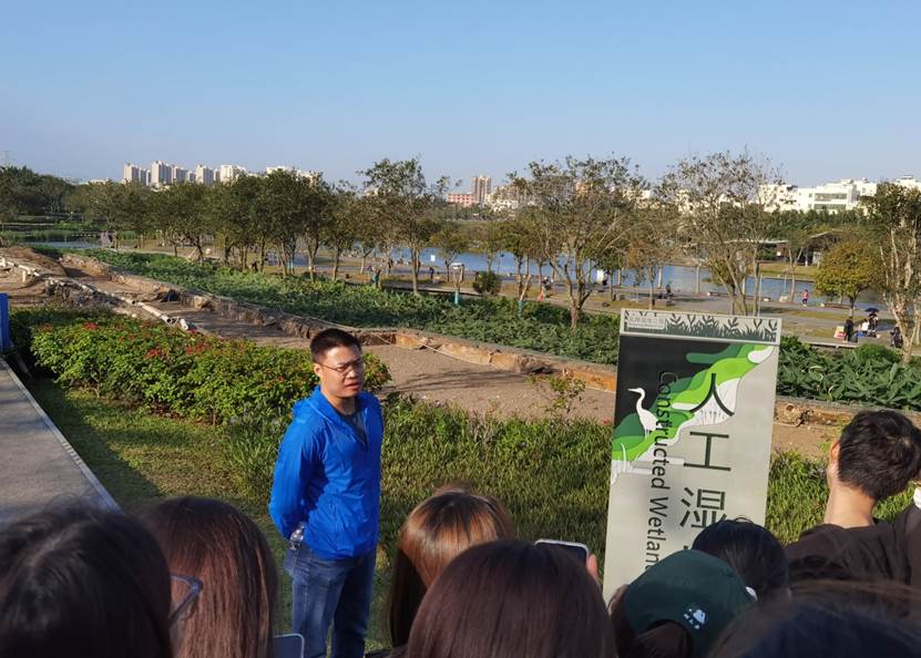 在凤翔湿地公园,潘老师向同学们实地介绍了美舍河如何从过去受到严重污染的黑臭水体变成如今的湿地公园,以及附近社区的生活污水在湿地公园是如何进行生态净化处理。潘老师重点阐述了该公园利用天然地形高差修建了八级人工梯田,在每一级人工梯田栽植不同的水生植物,通过这些植物对污水进行逐级净化处理,待污水达到净化标准后再排入附近的美舍河,这一过程很好地体现了“绿水青山就是金山银山”的生态理念。此外,潘老师还向大家介绍了海绵城市,以及湿地公园对建设海绵城市的重要意义(图2和图3)。