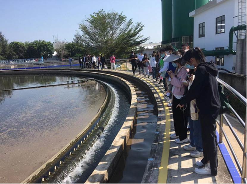 在白沙门污水处理厂参观考察期间,潘老师邀请厂方代表黄工为同学们做讲解(图4)。黄工向同学们介绍了该厂对生活污水进行处理的主要工艺流程,并带领大家参观了其中的格栅车间、沉砂池、曝气池、沉淀池、以及除臭装置,让同学们第一次近距离接触污水处理设施(图5),加强了对污水处理有关知识的了解。