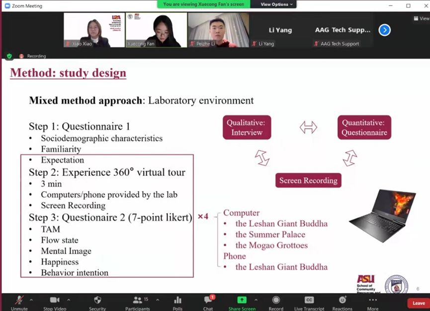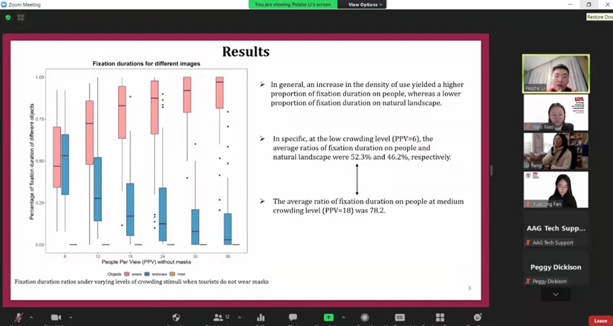 公司本科18级人文地理与城乡规划3班范雪聪同学、19级酒店管理2班李沛哲同学与公司肖潇老师,在2022年美国地理学年会上(2022 Annual Meeting of American Association of Geographers),就自己研究的题目:“Tourists’ gazing behaviors and stress appraisals in national parks during the COVID-19 pandemic: A multi-sensory perspective (新冠病毒大流行期间国家公园游客的凝视行为和压力评估:基于多感官理论的研究)”;“Tourists' visual behavior in 360° virtual tours: A mix method approach(基于混合研究方法的360度虚拟旅游中的游客视觉行为研究)”; “Social distancing and tourists' emotions in nature-based tourism destinations during the COVID-19 pandemic (新冠疫情背景下自然旅游地旅游者的社交距离与情绪管理研究)”进行学术演讲。值得一提的是范雪聪作为分会场主持人的身份以出色的英文能力主持了整场分会,会议取得了圆满的成功。