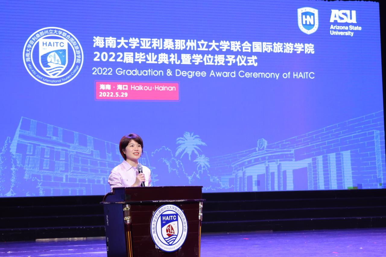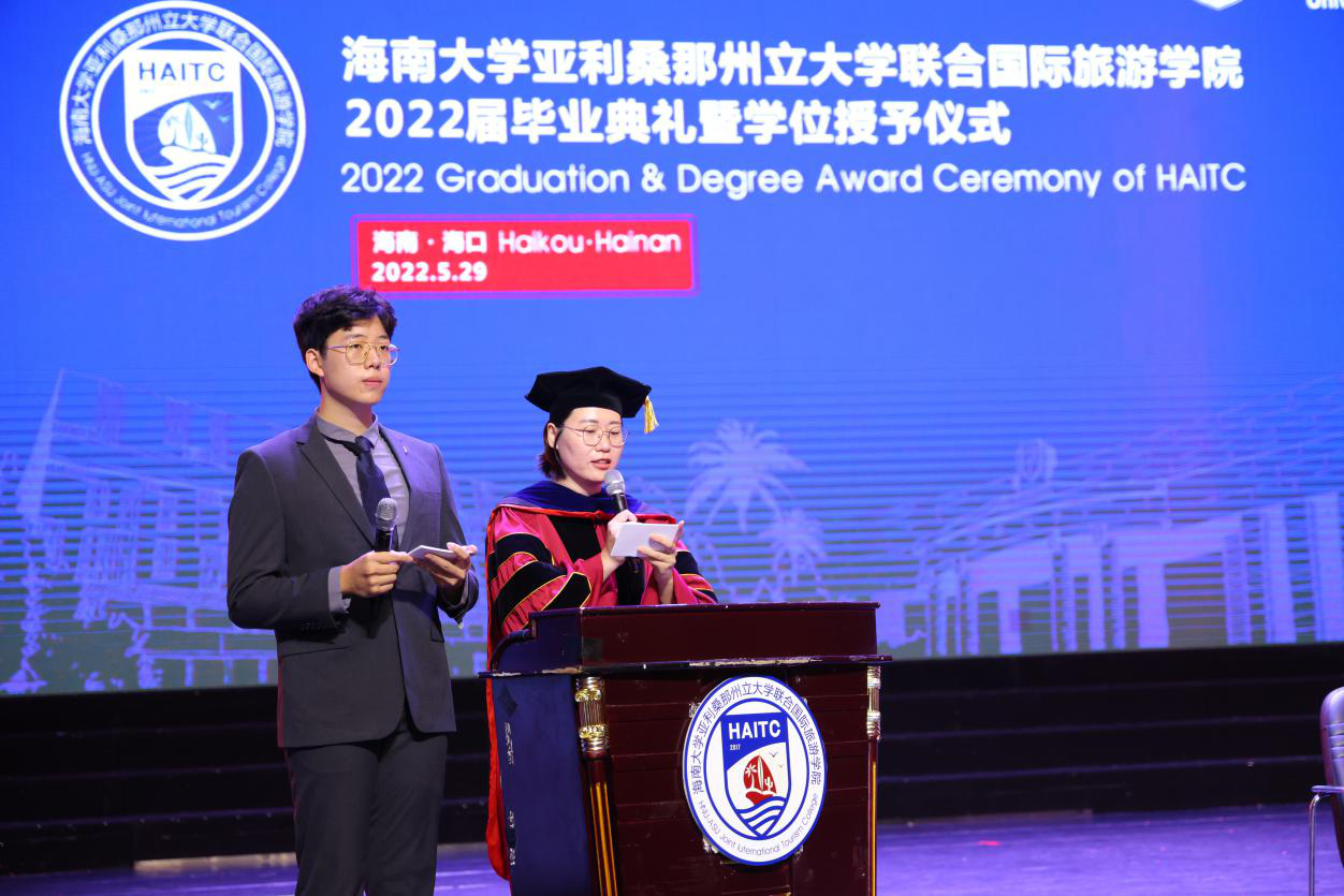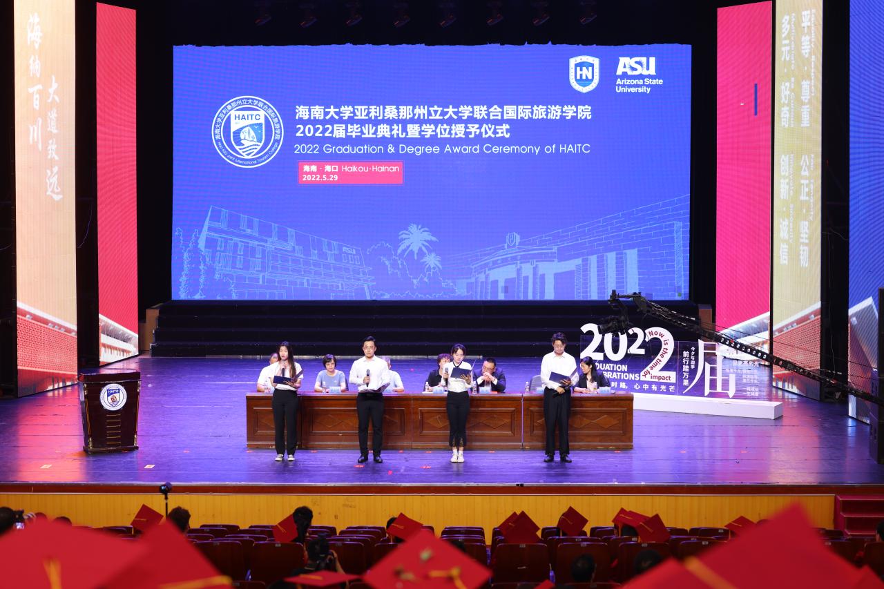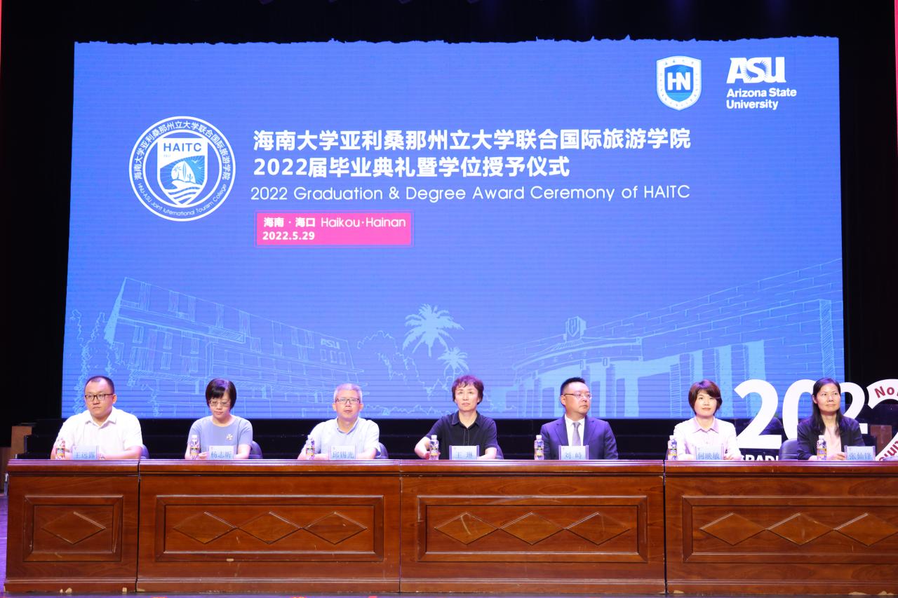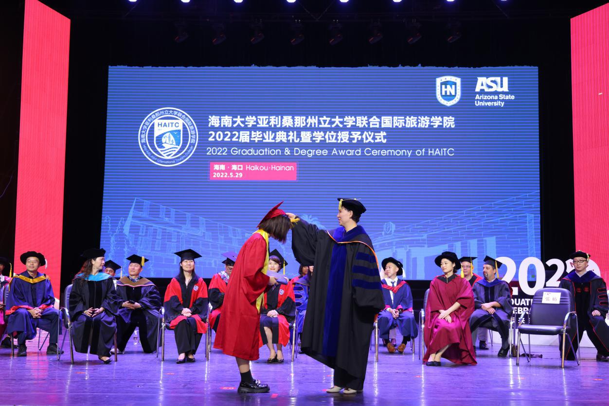 5月29日上午,国际旅游公司2022届毕业典礼暨学位授予仪式在金沙js5588思源学堂大礼堂举行。典礼特邀了联管会成员、金沙js5588教务处处长邱锡光,平安银行海南分行党委书记、行长刘峙等嘉宾出席。公司外方副经理、美国亚利桑那州立大学瓦茨公共服务与社区发展公司国际项目主任Kelly Bricker教授等通过互联网在线出席。全体2022届毕业生、全体公司领导班子成员及部分教职工参加了典礼。典礼由教师张昉博士和2019级苏家齐同学主持。
