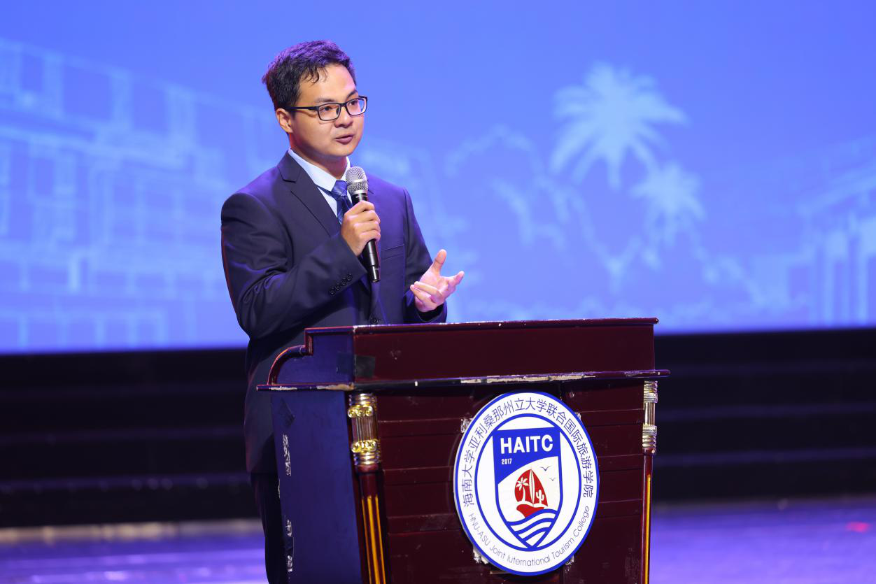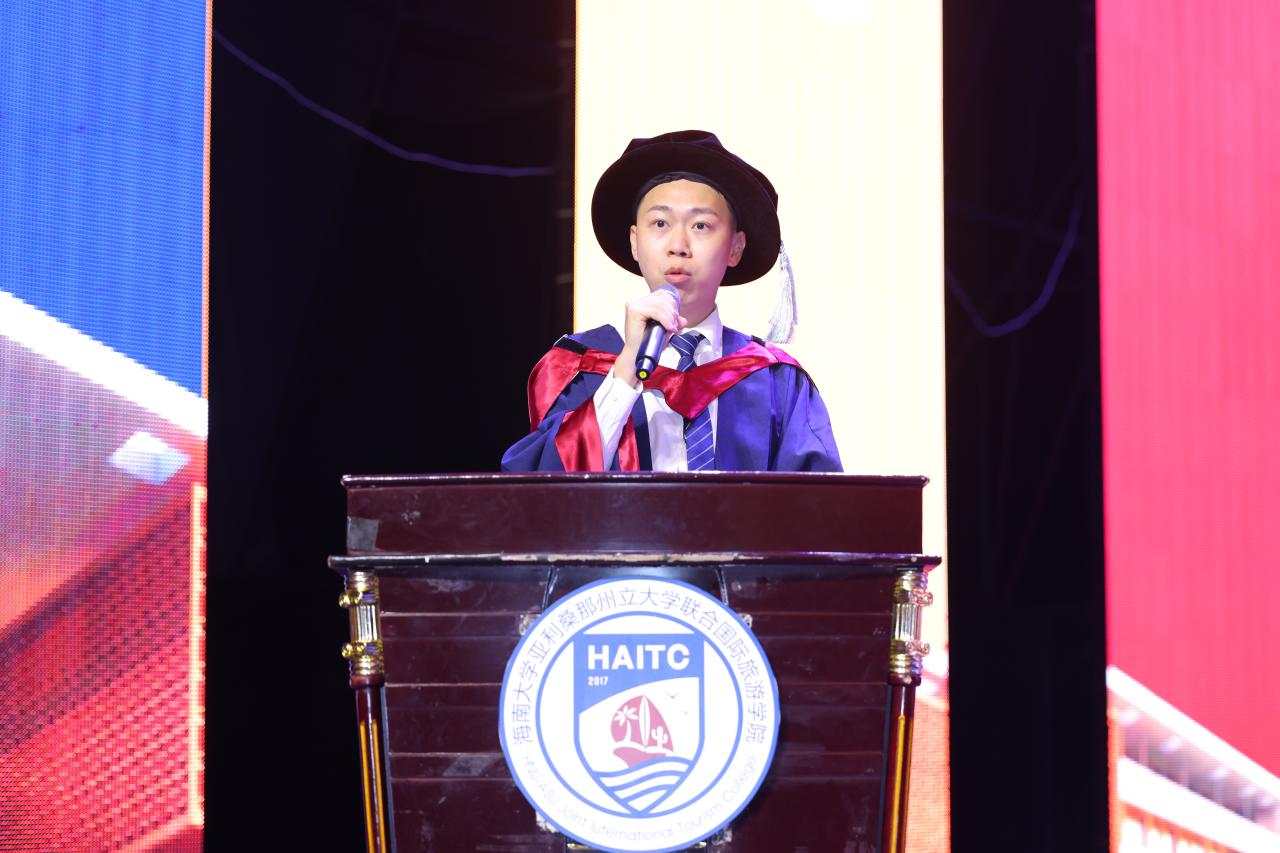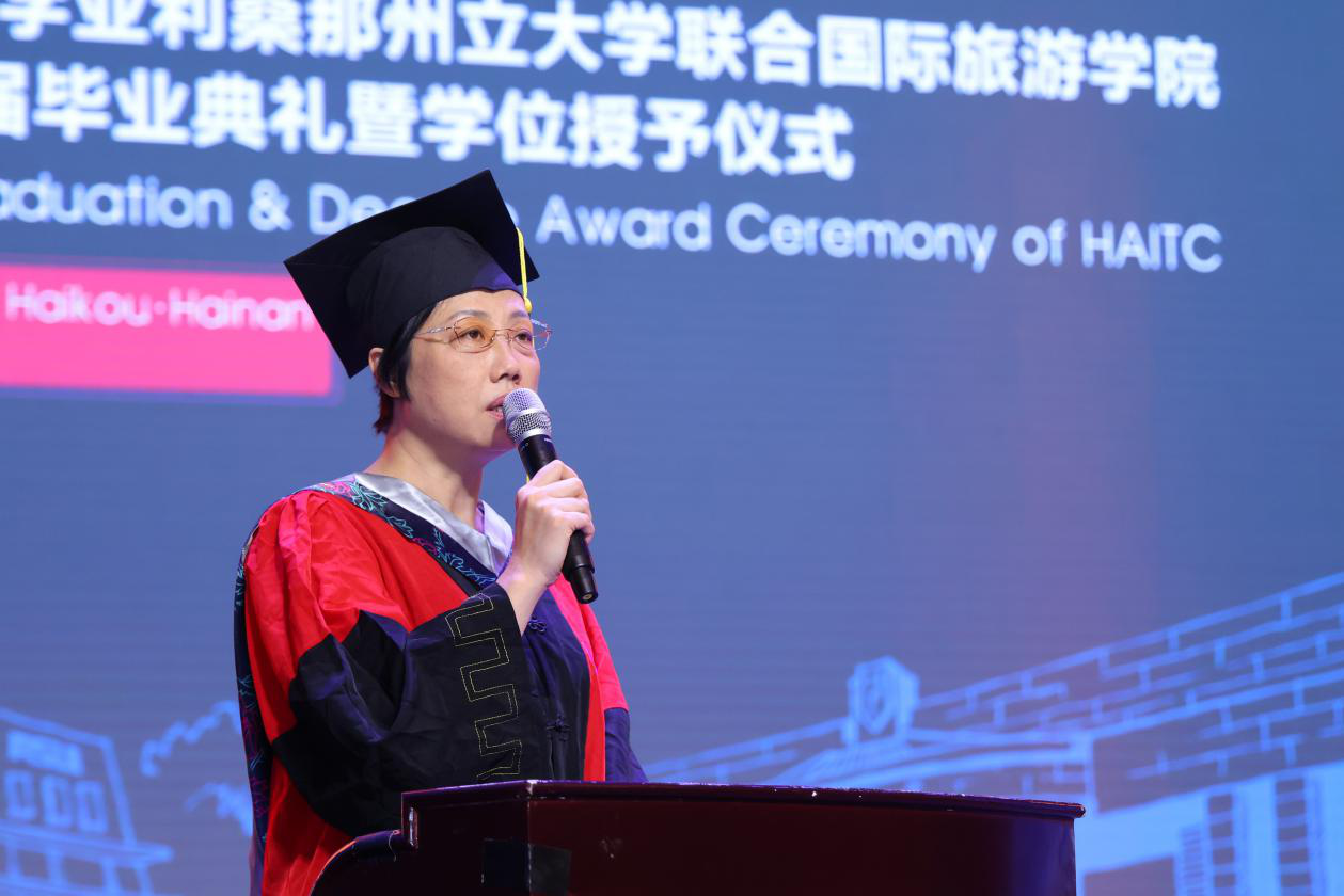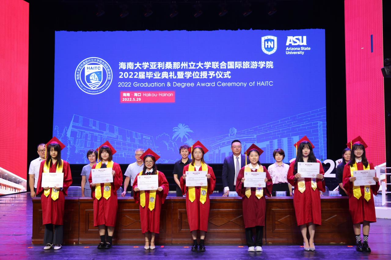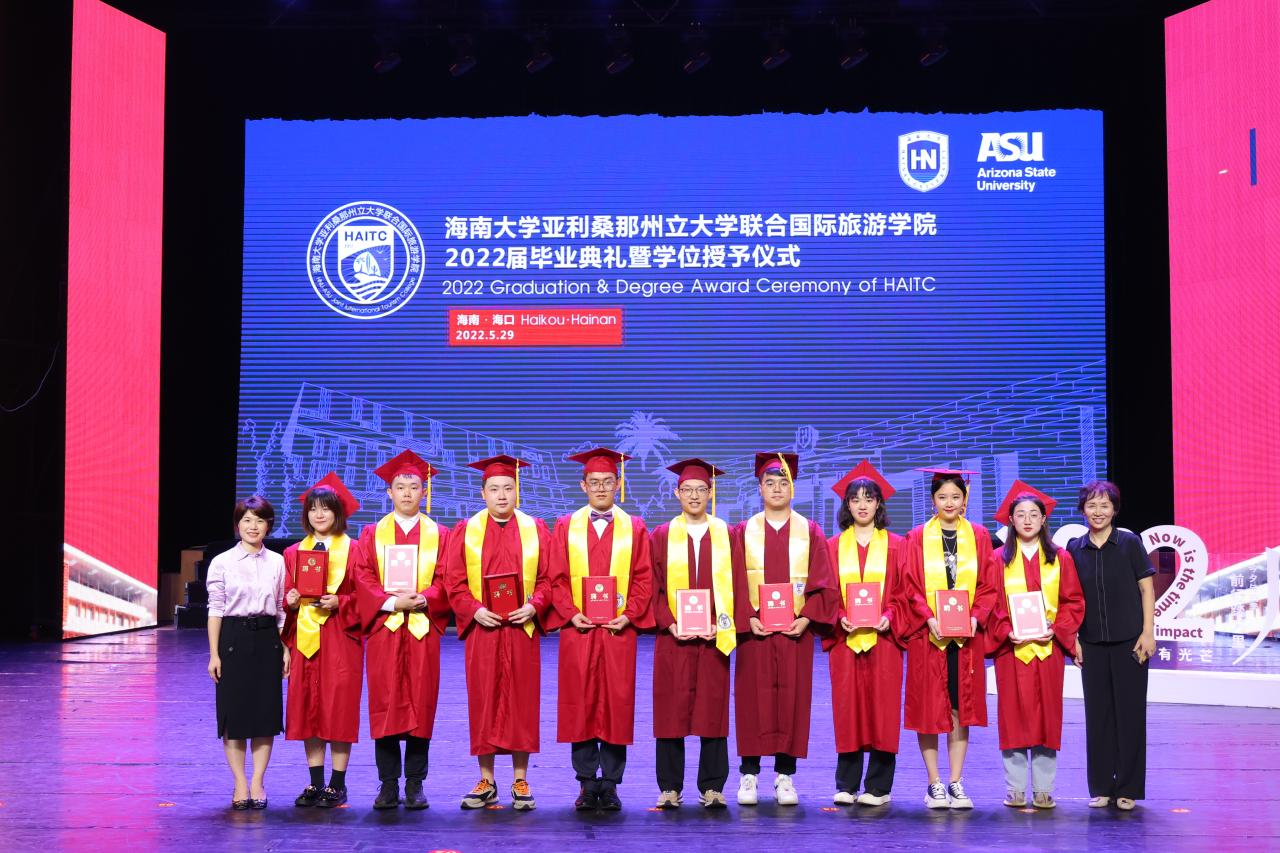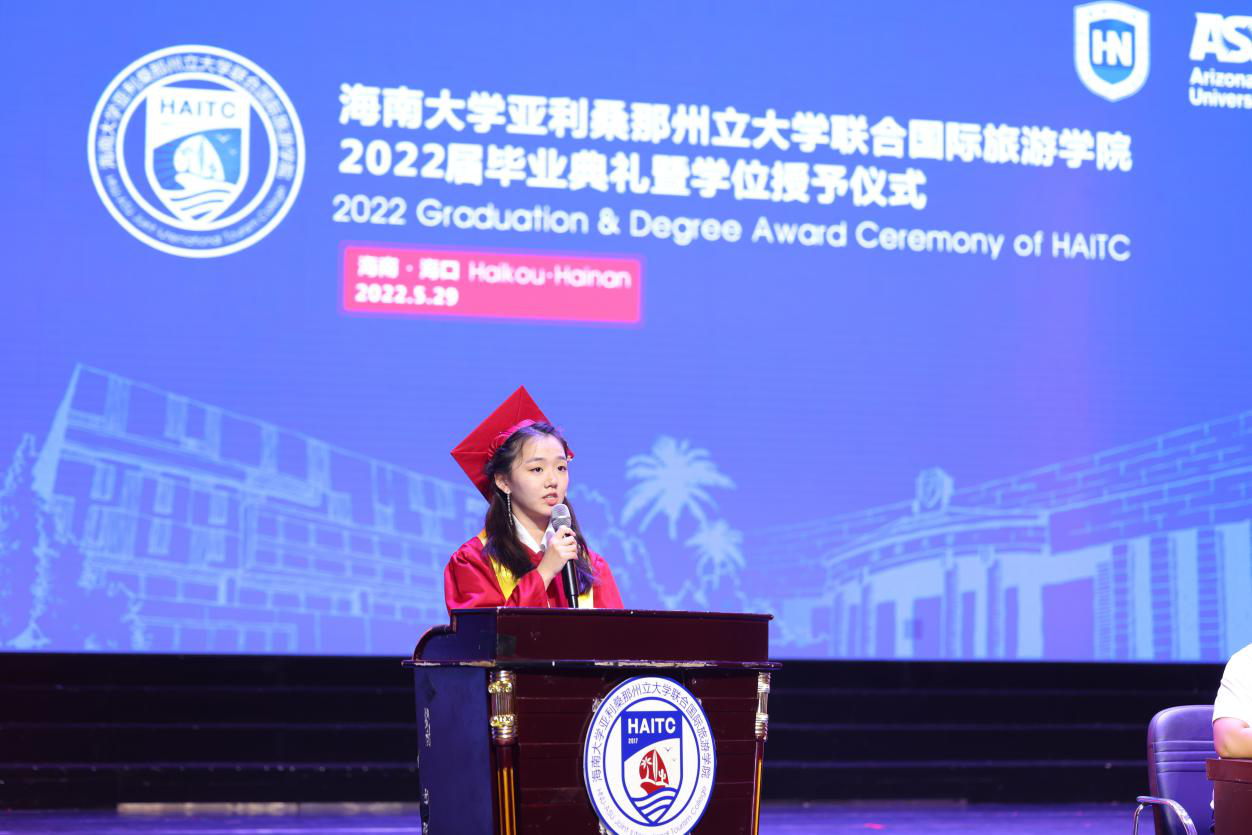 5月29日上午,国际旅游公司2022届毕业典礼暨学位授予仪式在金沙js5588思源学堂大礼堂举行。典礼特邀了联管会成员、金沙js5588教务处处长邱锡光,平安银行海南分行党委书记、行长刘峙等嘉宾出席。公司外方副经理、美国亚利桑那州立大学瓦茨公共服务与社区发展公司国际项目主任Kelly Bricker教授等通过互联网在线出席。全体2022届毕业生、全体公司领导班子成员及部分教职工参加了典礼。典礼由教师张昉博士和2019级苏家齐同学主持。