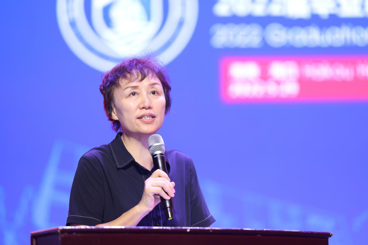 在经理致辞环节中,王琳经理代表HAITC的全体教职工为2022届毕业生送出最诚挚的祝贺和祝福。她同时告诫同学们,在这个充满了变革的大时代,在走向社会时也要学会调整预期、控制增量,适度调整自己的社交圈层、将更多的关注投向身边人,不断增强并保持幸福感。还要建立并保持长期的使命感与个人信念,理性面对所面临的处境和问题,使自己能够长远并坚定地沿着既定目标走下去。