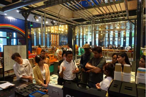 考察团接着到万宁石梅湾考察了作为“国家AA级旅游景区”M1咖啡奇幻工场,是以“家庭互动”和“亲子体验”为核心的大型主题沉浸式体验工场。考察团在这个针对全年龄段设立、强调可触摸与互动探索的咖啡空间里,体验了迷幻的光影咖啡树、体感交互投影、气动传输交响曲,深入了解了咖啡从种植起的制作过程,一致认为这里可以作为公司酒店管理专业的实习实训基地。