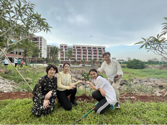 观澜湖校区管委会主任李艳荣、国际旅游公司经理王琳、国际旅游公司党委书记何映敏等带领大家实地参观了校区教学楼,向毕业生们详细讲解了观澜湖校区的建设进展和功能布局。培土围堰、提水浇灌……在参观完毕后,师生们两两协作,兴致勃勃地接连种下荔枝、黄皮、芒果等海南特有果树树苗。师生们一边劳动,一边交流校区建设、公司未来和个人发展,现场气氛热烈,毕业生们纷纷表示,观澜湖校区是国际旅游公司未来发展倚仗的重要办学地点,希望公司凭借观澜湖地区国际化程度高和旅游款待业产业集中的办学环境优势,在培养理论与实践并重的国际化人才方面取得进一步的成绩。