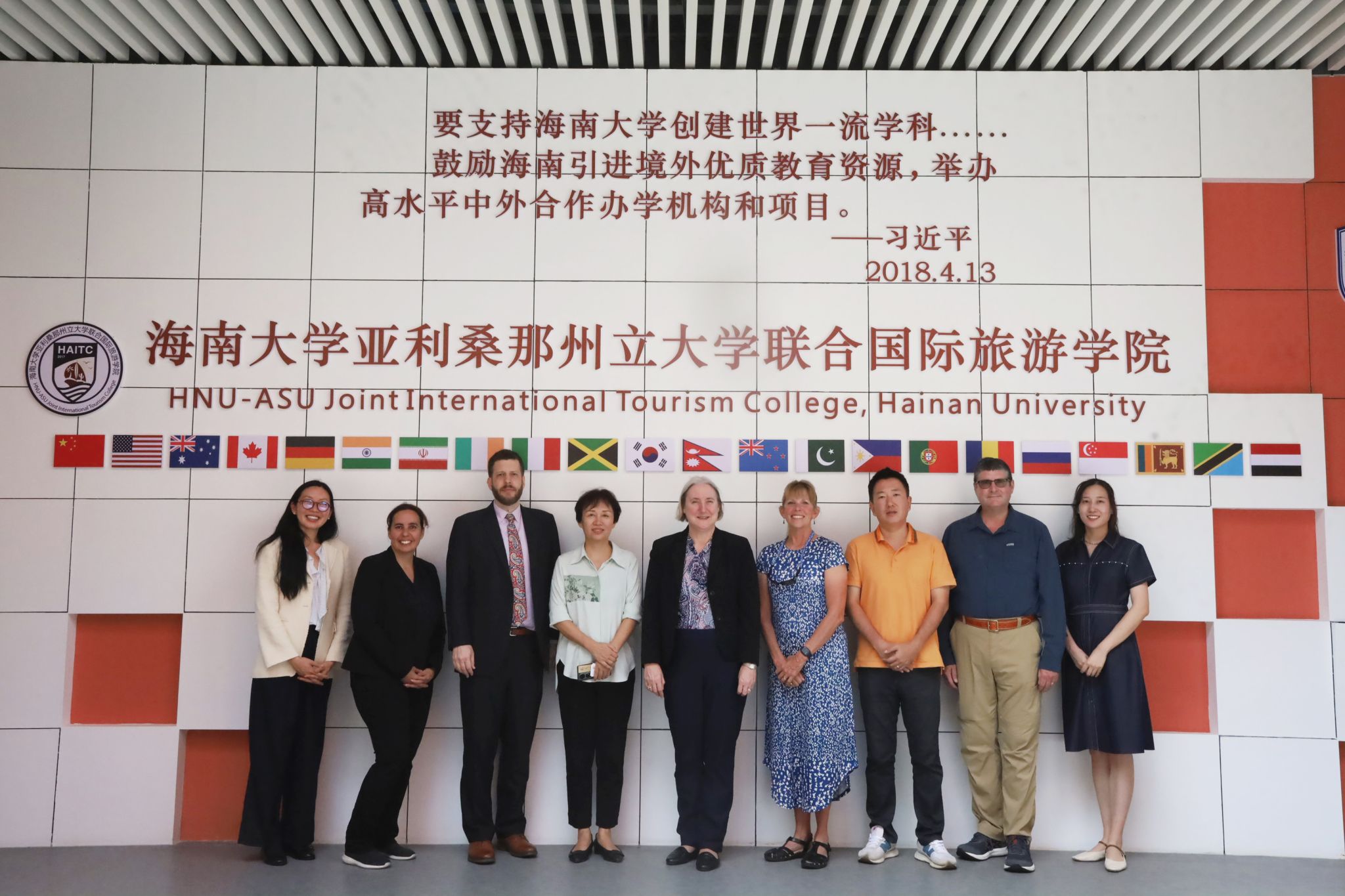 王琳经理代表公司欢迎总领事带队来公司访问,并简要介绍了公司的办学情况以及海大和ASU合作的现状及展望。Kelly Bricker教授代表ASU表示热烈的欢迎并介绍了ASU目前在公司的团队情况。教师代表Jong Hyeong Kim博士和Walter Richard Huber博士也分别分享了在公司的工作情况和工作进展。美国驻广州总领事馆总领事Lisa Heller耿欣对公司的合作机制及办学成果给予充分认可并探讨了总领事馆在其业务范畴内可提供的支持。美国驻广州总领事馆团队还参观了观澜湖校区的环境建设并合影留念。