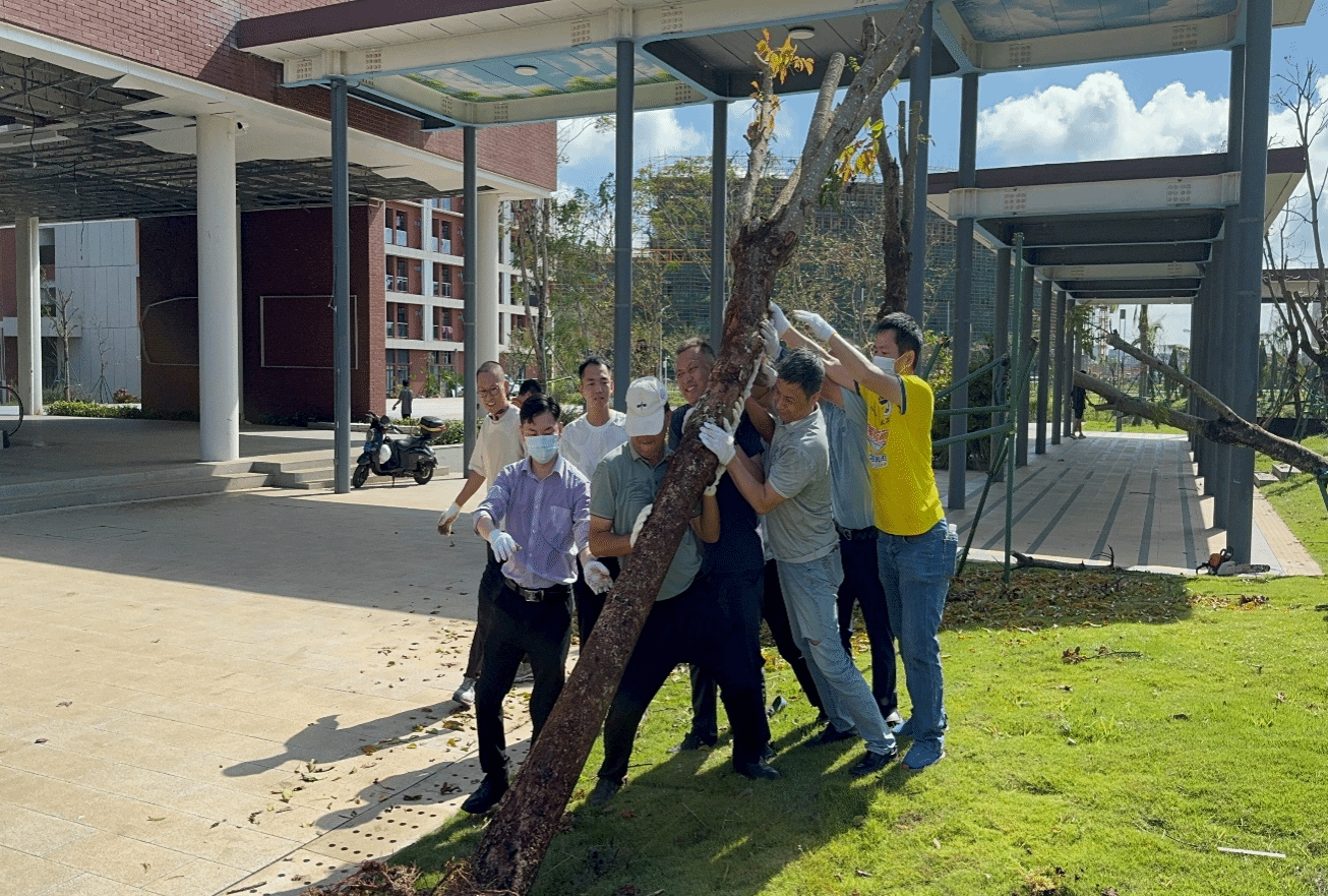 超强台风过后,校园内树木倒伏,杂物散落,一片狼藉。公司党员教师和行政干部主动请缨,卷起袖管,清理落叶和路障,扶起倒塌树木残枝。在大家的齐心协力下,各主干道已经基本通畅。